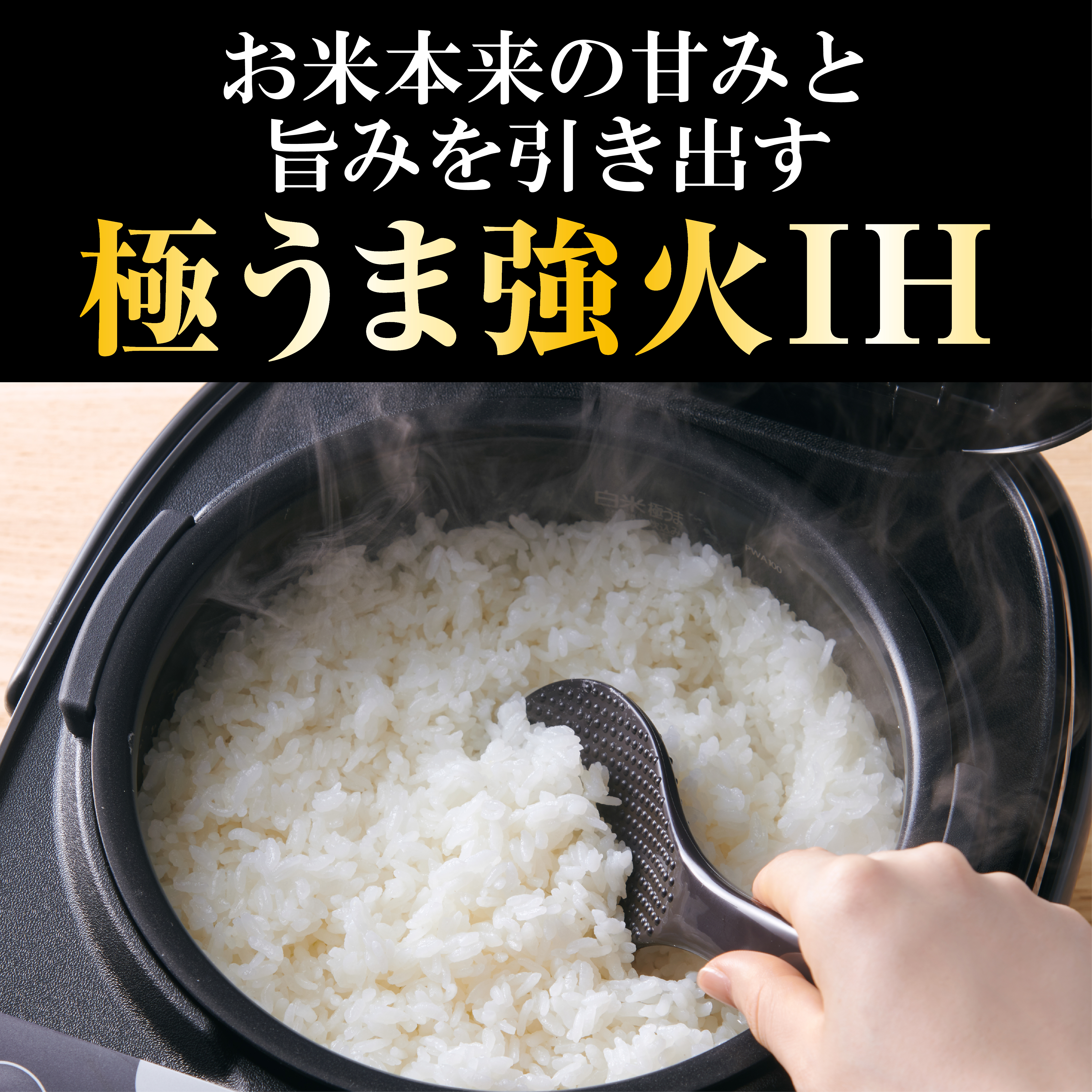 お米本来の甘みと旨みを引き出す「極うま強火IH」。高加熱で内なべの底と側面から、内なべ全体を強火で包み込んで加熱し、芯までふっくら炊きあげます。また約110~115度の高温蒸らしで、お米のα化を促進し、本来の甘みと旨みを引き出します。