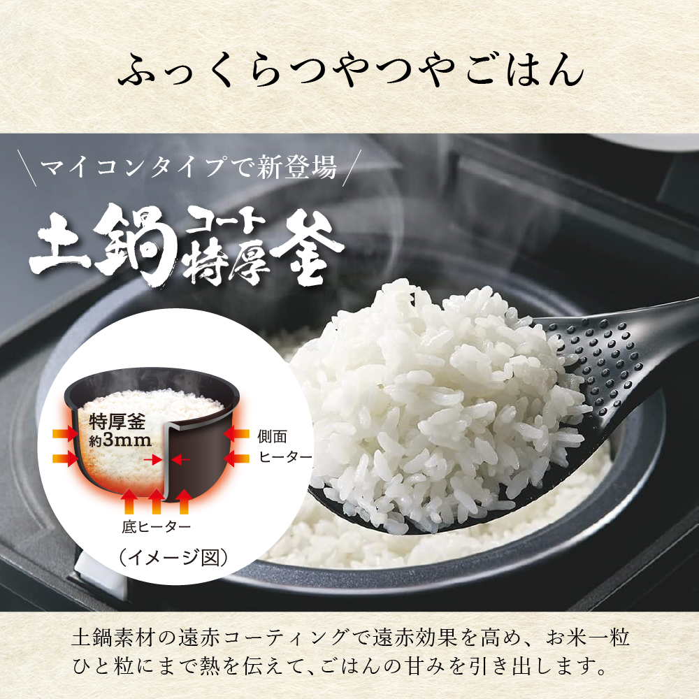 遠赤効果の高いコーティングを施した「土鍋コート特厚釜」。厚さ約3mmの内なべの高い蓄熱性により、しっかりと熱を加えます。土鍋素材の遠赤コーティングで遠赤効果を高め、お米一粒ひと粒にまで熱を伝えて、ごはんの甘みを引き出します。