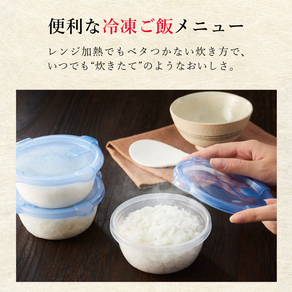 冷凍用のごはんがおいしく炊けるプログラムを採用。冷凍したごはんを解凍した際に起こるごはんの“パサつき”や電子レンジでの再加熱時の“ベタつき”を解消するために、白米よりも時間をかけて吸水し、芯までふっくら炊きあげることで、冷凍保存してもおいしさを保ちます。