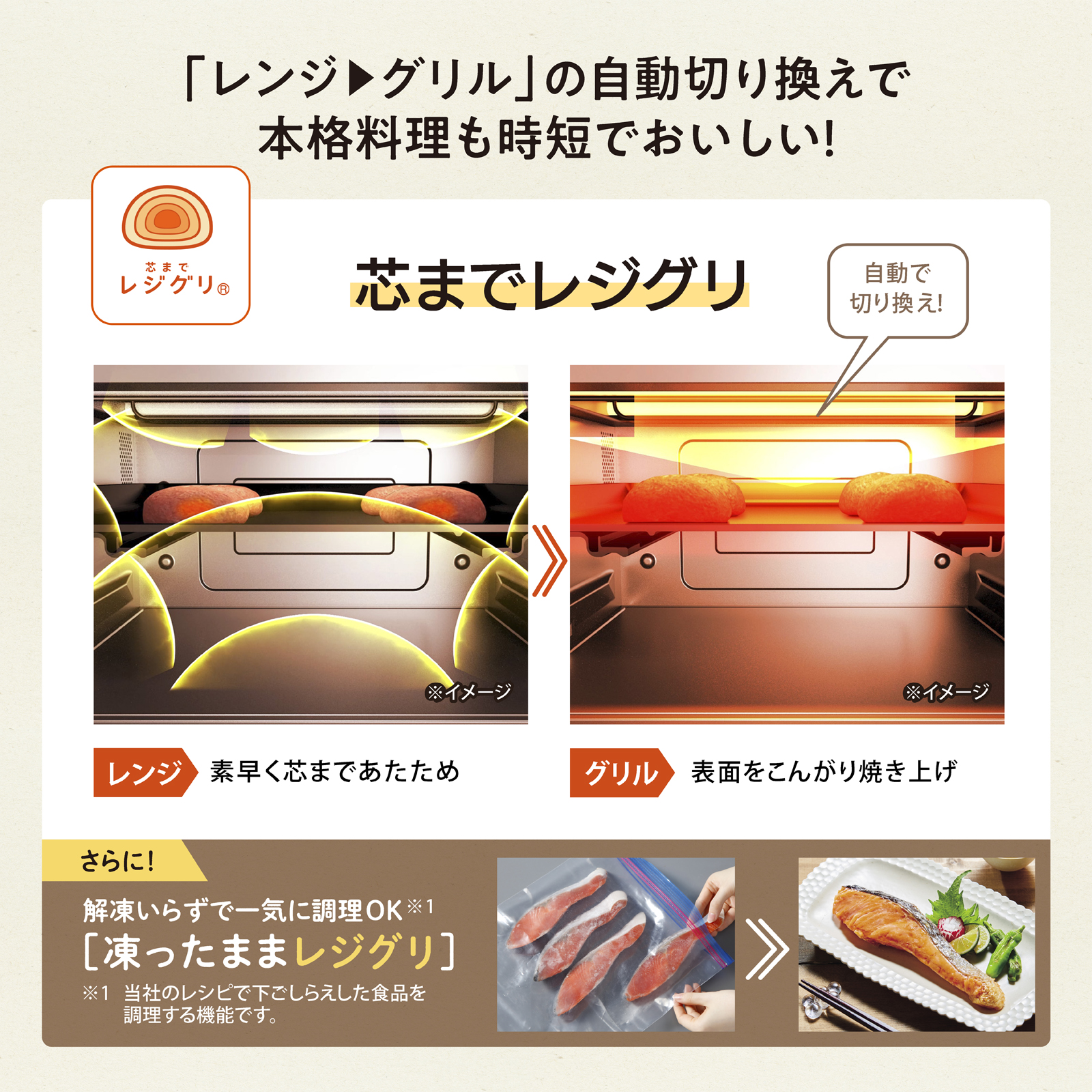 ■レンジ加熱とグリル加熱を自動で切り換え、時短で本格料理ができる「芯までレジグリ」