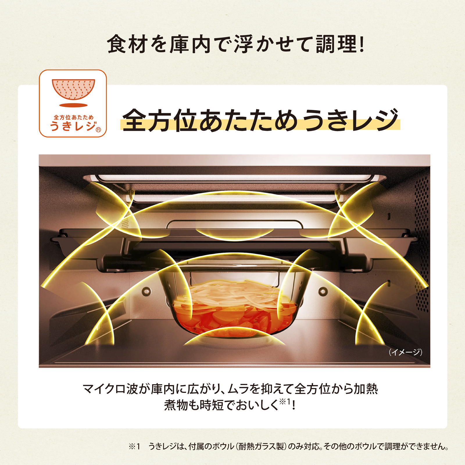 ■食材を庫内で浮かせて調理する「全方位あたため うきレジ」