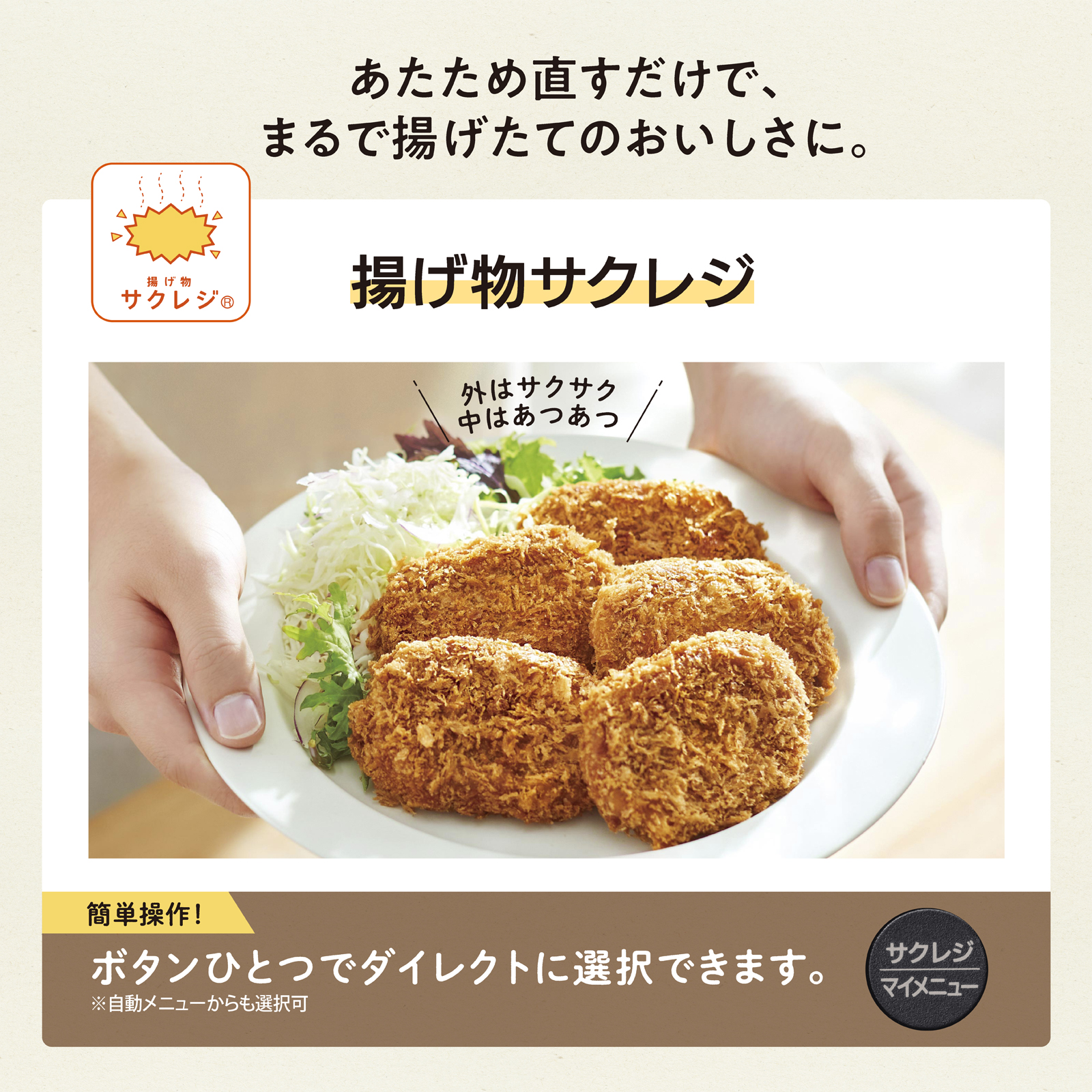 「揚げ物 サクレジ」なら、冷めてしまった揚げ物のあたため直しも、短時間で衣はサクサク、中はホクホクの揚げたてのようなおいしさに仕上げます。専用のキーがあるのでダイレクトに選択できます。
