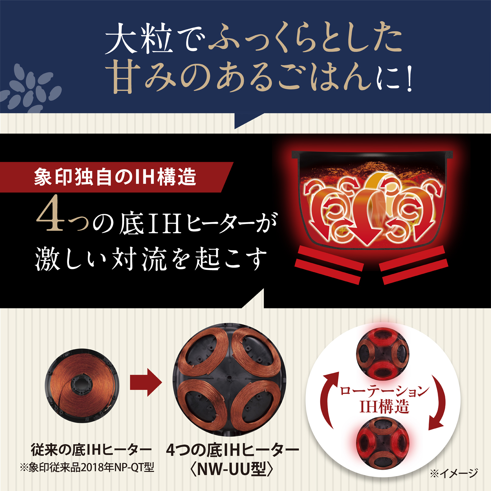 部分的な集中加熱を可能にした象印独自の炊き方です。底IH ヒーターの加熱範囲を