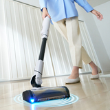 青色LEDヘッドライトが床のゴミやホコリを浮かび上がらせ、可視化することで取り残しを防ぐ