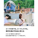 コードレス利用可能なため、屋外でも屋内でも場所を選ばず、好きな場所へ持っていけます。お風呂場の脱衣所、クーラーのないキッチン、庭でのガーデニング、キャンプなどこれ一台で様々なシーンで使えます。