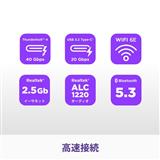 Wi-Fi 6E、2.5G LAN、Bluetooth 5.3に加え、Thunderbolt 4、USB 3.2 Gen 2x2 Type-C(20Gbps)など、多彩なインターフェースで快適な通信環境を提供します。
