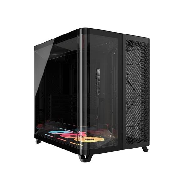 トリプルチャンバーと曲面ガラスパネルを採用したミドルタワーケースです。iCUE LINK対応ハブとLX120Rリバースローターファンを標準搭載し、ケーブル1本でライティングやファンを一括管理可能。背面配線対応マザーボードにも完全対応しています。