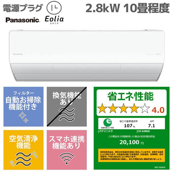 【クーポン対象外】  Panasonic エアコン eolia(エオリア)Xシリーズ 10畳/2.8kW/100V/ナノイーX48兆/フィルター自動お掃除付/W/2026年度 CS-X286D-ESET