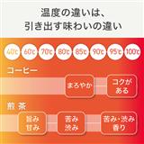 温度を変えることで、普段の飲み物の味わいは変わります。温度を変えて、飲み物をもっとおいしく。コーヒー以外にも、緑茶、紅茶、ハーブティーなど、それぞれお好みの温度で楽しむことができます。湯沸かしの温度設定は8段階。40/60/70/80/85/90/95/100での設定が可能です。