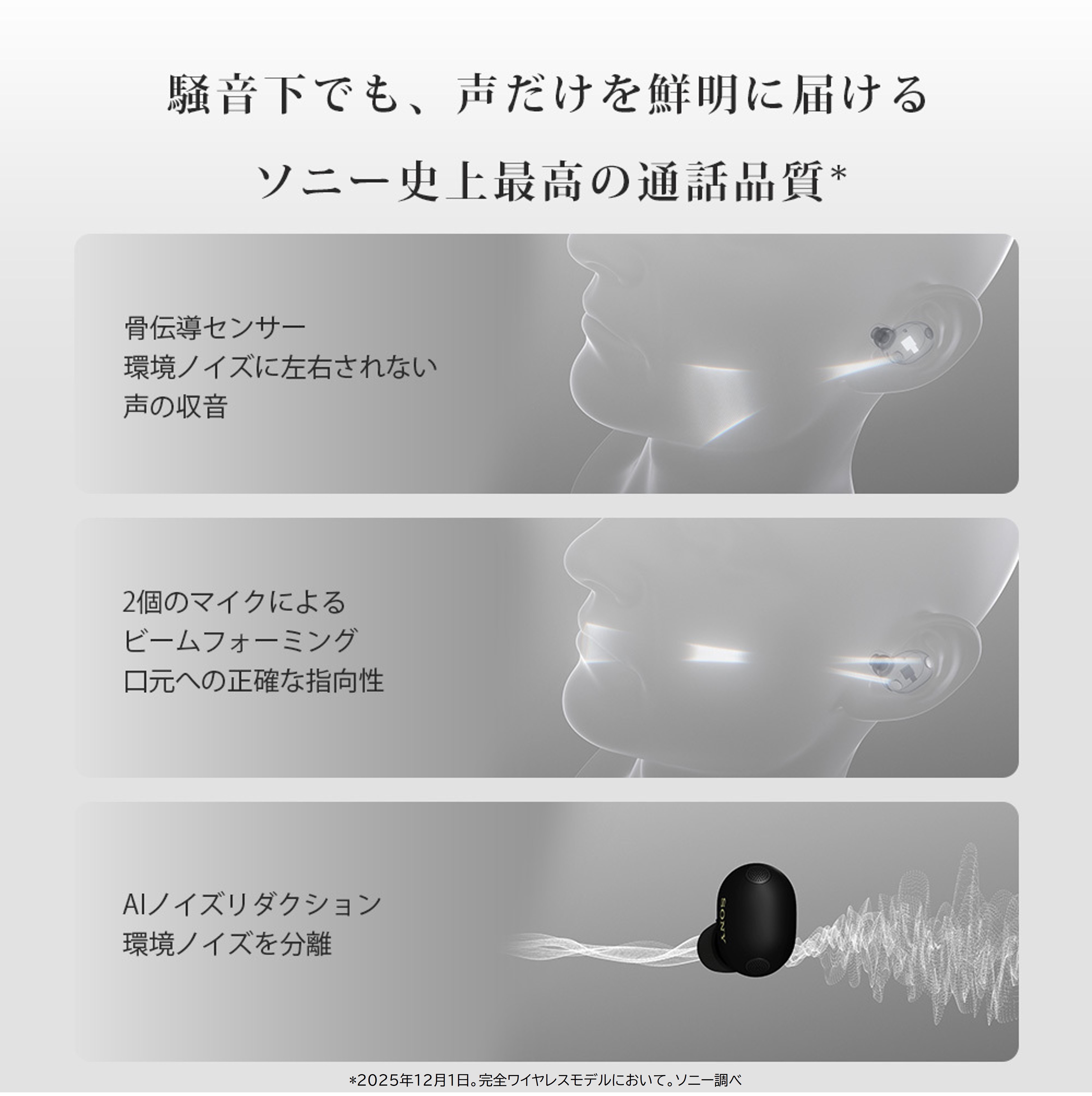 片側2個のマイク+骨伝導センサー+AI制御によるクリアな通話