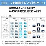 むずかしい設定はいっさい不要。顔の有無や、光の加減など、撮影時の多彩なシーンを判別して、カメラが自動で設定を行うので、どんなシーンもかんたん、キレイに写せます。※1撮影シーンが暗い時に、三脚などでカメラを固定すると表示されます。※2識別可能シーンから選ばれたアイコンが、適宜表示されます。 ※シーンによっては、実際のシーンと異なるアイコンが表示されることがあります。