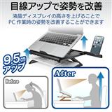 ノートPCの画面部分を上げ目線をあげることできPC作業時の姿勢を改善することができる、8段階角度調整機能と折りたたみ式9.5cm高さアップ脚の付いた折りたたみ式ノートPCスタンドです。