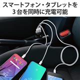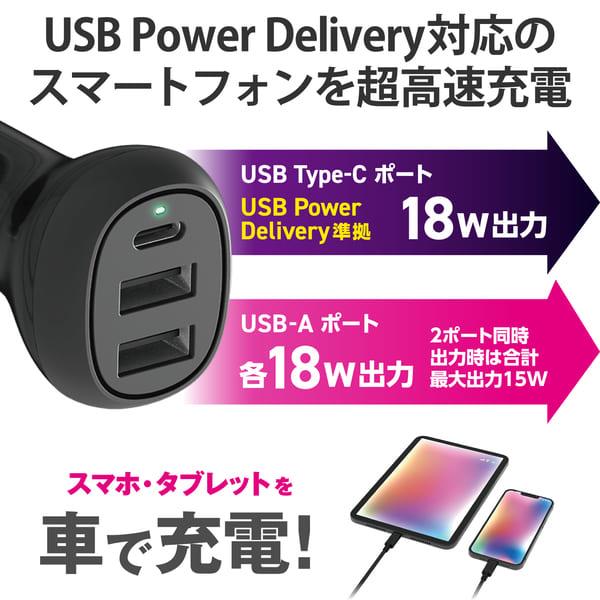 USB Power Delivery規格に準拠したUSB Type-C(TM)(USB-C(TM))ポート1つと、USB-Aポートを2つ搭載し、スマートフォンなどを合計3台充電できる車載充電器。