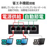 ■らくらく節電機能により接続していないポート、リンクしていないポートを自動的に判別し、電力供給を抑えます。パソコンがシャットダウンしている環境では、大幅な電力の節約を実現することができる、省エネ法に準拠したスイッチングハブです。