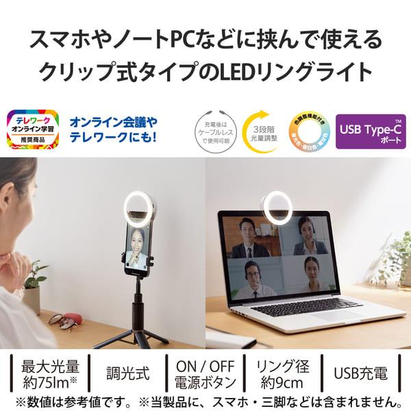ELECOM LEDリングライト 直径9cm クリップ式 3段階調光 USB充電式 自撮り ホワイト DE-L04WH