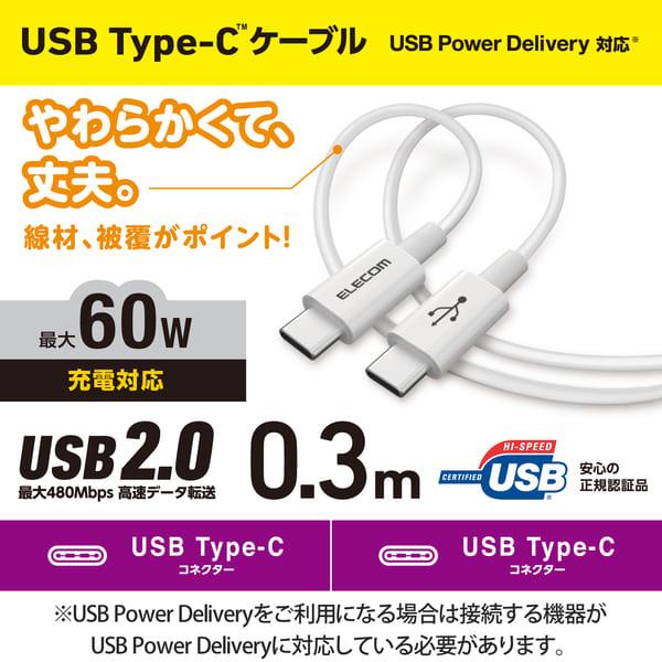 ELECOM USB TypeCケーブル (タイプC to C) 0.3m PD 60W 断線に強い 耐久仕様 やわらかい ホワイト MPA-CCYS03NWH