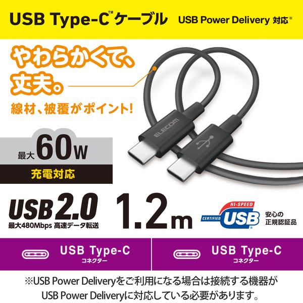ELECOM USB TypeCケーブル (タイプC to C) 1.2m PD 60W 断線に強い 耐久仕様 やわらかい ブラック MPA-CCYS12NBK