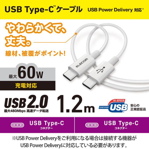 ELECOM USB TypeCケーブル (タイプC to C) 1.2m PD 60W 断線に強い 耐久仕様 やわらかい ホワイト MPA-CCYS12NWH