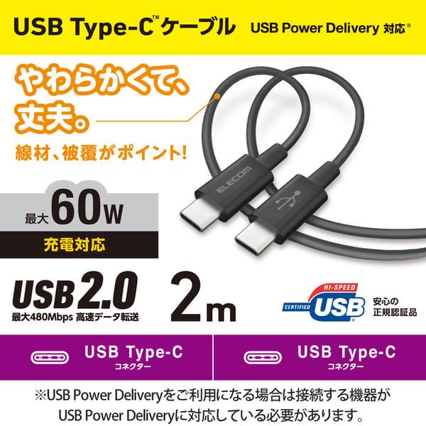 ELECOM USB TypeCケーブル (タイプC to C) 2m PD 60W 断線に強い 耐久仕様 やわらかい ブラック MPA-CCYS20NBK