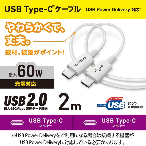 ELECOM USB TypeCケーブル (タイプC to C) 2m PD 60W 断線に強い 耐久仕様 やわらかい ホワイト MPA-CCYS20NWH