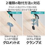 ■デスクの天板に挟んで固定するクランプ式と、天板に穴を開けてボルトを通して固定するグロメット式の2通りの取り付け方法が選べます。