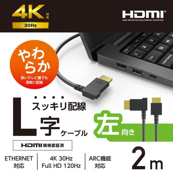 ELECOM HDMI ケーブル HIGH SPEED with Ethernet L字 左向き 2m 4K 30Hz やわらか RoHS指令準拠 ブラック CAC-HD14EYL20BK