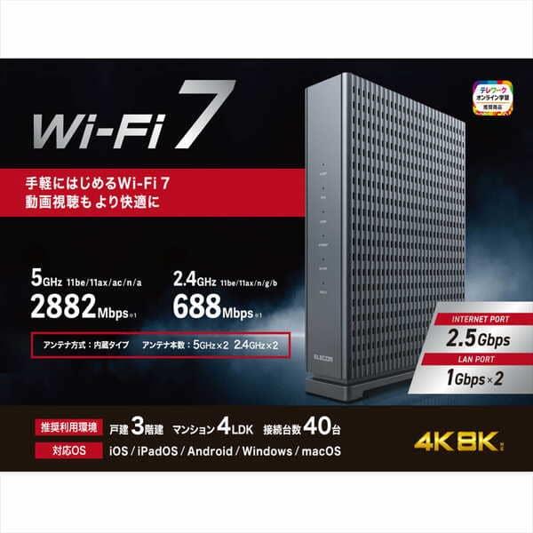 | 無線伝送速度[802.11be](理論値) | IEEE 802.11be:5GHz帯 最大2882Mbps 2.4GHz帯 最大688Mbps(※) ※受信は最大574Mbps、送信は接続機器が4096QAM通信対応の場合、最大688Mbps |