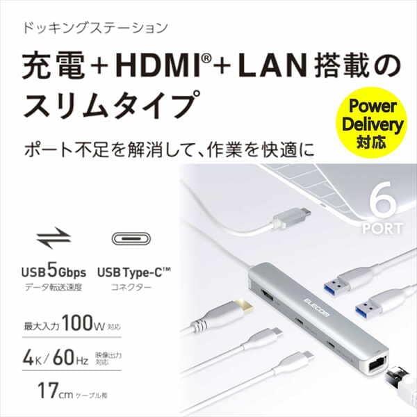 ELECOM USB TypeC ドッキングステーション ハブ 6-in-1 PD 85W出力 急速充電 USB-C×2 USB-A×2 HDMI×1 RJ45×1 シルバー DST-C30SV