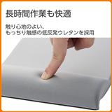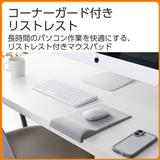 手首の負担を軽減するリストレストと、デスクの角を保護するコーナーガードクッションを備えています。