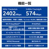 | 無線伝送速度[802.11ax](理論値) | IEEE 802.11ax:5GHz帯 最大2402Mbps 2.4GHz帯 最大574Mbps |