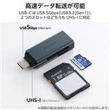 ■パソコンやタブレット、スマートフォンとの接続はUSB 5Gbps(USB3.2(Gen1))、2つのスロットはどちらもUHS-I(最大104MB/s)に対応しているので、高速データ転送が可能です。
