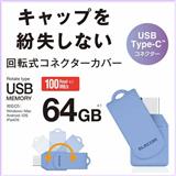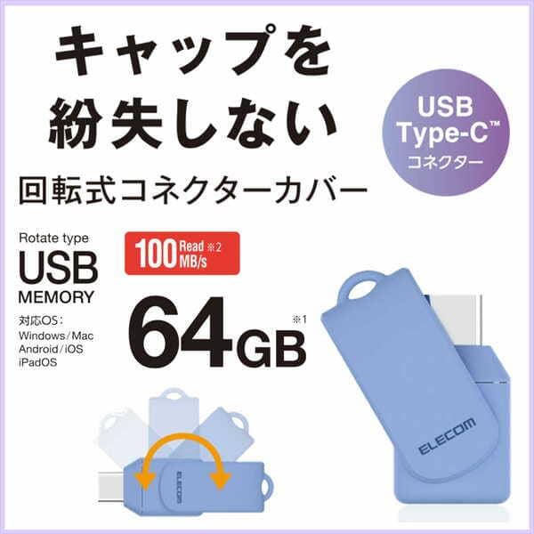 ELECOM USBメモリ 64GB USB Type-C 高速転送 回転式コネクタ ストラップホール付 セキュリティ対応 ブルー MF-CEU3064GBU