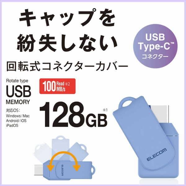 回転収納式でキャップを紛失する心配がない、USB Type-CコネクターのUSBメモリです。