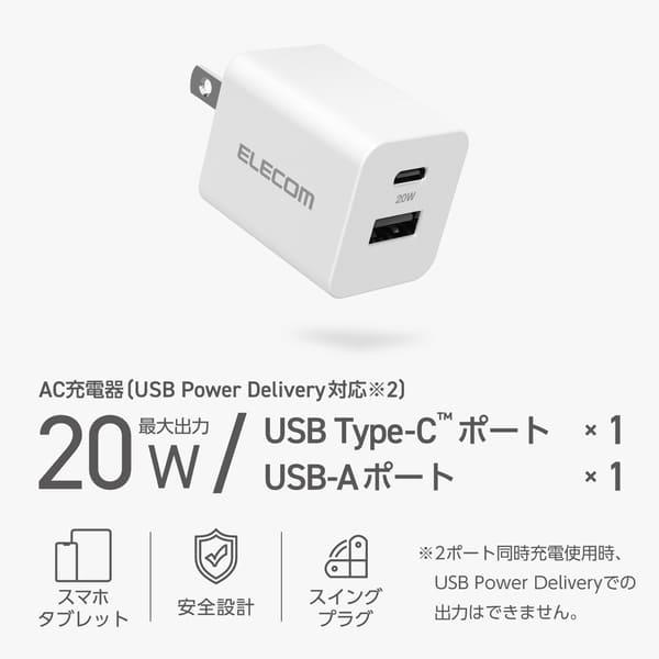 ELECOM 充電器 USB Type-C 20W PD対応 2ポート USB-C USB-A コンセント iPhone iPad Android 折りたたみ式プラグ ホワイト MPA-AC12020WH