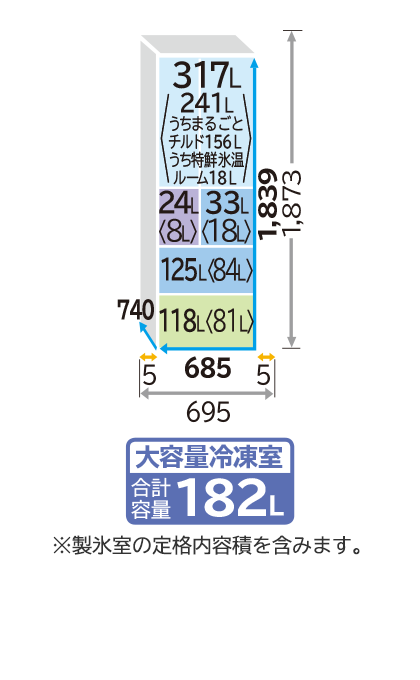 ※1 冷凍室上下段、製氷室の定格内容積の合計。食品収納スペースの目安は110L。