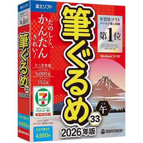 「筆ぐるめ」は”たのしく・かんたん・きれい”がコンセプトの初心者でもかんたんに使える年賀状ソフトです。書家監修のレイアウトで宛名を綺麗に配置、2万点以上の素材やフォント152書体を収録しています。