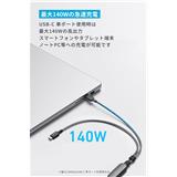 USB-C 単ポート使用時は、最大140Wの高出力。お使いのスマートフォンやタブレット端末、ノートPC等のUSB-Cポート搭載機器へ充電が可能です。高耐久ナイロン素材を使用し、10,000回以上の折り曲げにも耐える優れた耐久性を実現しました。