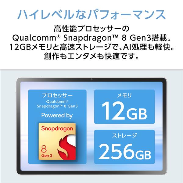 高性能プロセッサーのQualcomm Snapdragon 8 Gen3搭載。12GBメモリと高速ストレージで、AI処理も軽快。創作もエンタメも快適です。
