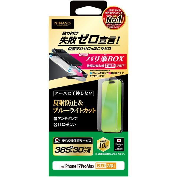 NIMASO iPhone 17 ProMax フィルム ケースに干渉しない 反射防止、ブルーライトカット バリ楽 NI-G1-17DAGBL3