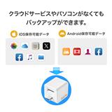 スマホを充電(USBーC)するだけで、写真や動画などのデータを自動でバックアップ(コピー保存)。ネット接続不要で、クラウドサービスやパソコンがなくてもバックアップ可能。