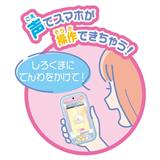 「しろくまにでんわをかけて」と話しかけると、画面にしろくまが!他にも、おんせいカメラ、アプリをひらく、日本語を英語に翻訳するなど、音声に反応するよ。