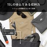 メイン収納とは別に仕切られたスペースを備えた2ルーム構造で、濡れたものと乾いたもの、衣類と小物などを分けて収納できます。15L容量で旅行やレジャーにも便利です。
