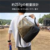 約257gと軽量で、アウトドアやフェスなど荷物が増えやすいシーンでも負担になりません。撥水性のある軽量素材を採用し、使い勝手と耐久性を両立しています。