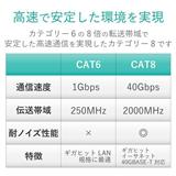 ■Cat6の8倍である2000MHzまでの高周波帯域まで対応しており、ノイズ干渉にも強く、高速で安定したネットワーク環境を実現します。