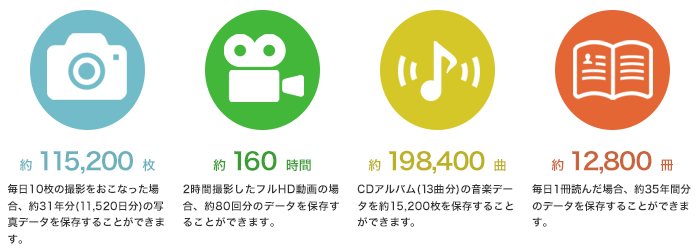 動画:フルHD(13Mbps) 109MB/分、音楽:AAC(5分 128kbps) 4.8MB/曲、本:コミック(200ページ) 70.6MB/冊