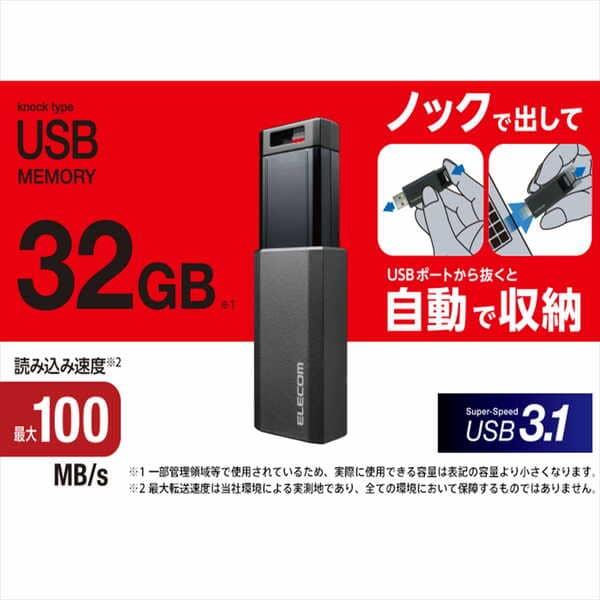 ELECOM USBメモリ USB3.1(Gen1) ノック式 32GB オートリターン機能 1年保証 ブラック MF-PKU3032GBK