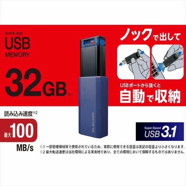 ELECOM USBメモリ USB3.1(Gen1) ノック式 32GB オートリターン機能 1年保証 ブルー MF-PKU3032GBU