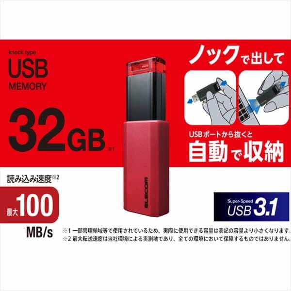 ELECOM USBメモリ USB3.1(Gen1) ノック式 32GB オートリターン機能 1年保証 レッド MF-PKU3032GRD