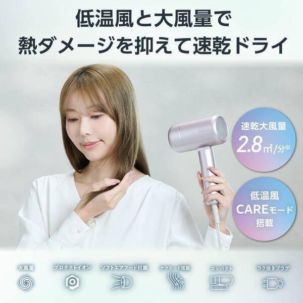 ヘアカラーなどのダメージが気になる髪をいたわる、低温のケアモードを搭載したヘアドライヤーです。