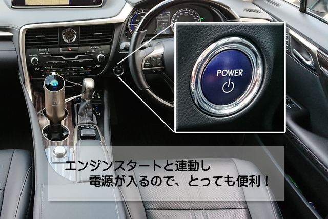 付属のシガーソケットへ装着する「USBシガーアダプター」を使用すれば、12Vと24Vの両対応をしていますので、普通車だけではなくトラック等の大型車でもお使いいただけます。 長距離運転の中で花粉に悩まされる方、アロマを楽しみたい方にもオススメです!